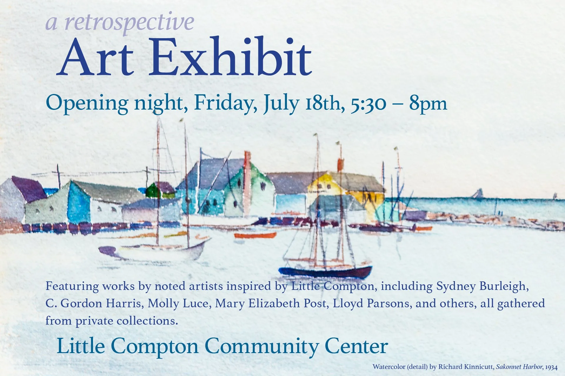 A Retrospective Exhibit of works by noted artists who had a Little Compton connection will be featured. Gathered from private collections, works by David Aldrich, Debbie Bodington, Sydney Burleigh, C. Gordon Harris, Molly Luce, Mary Elizabeth Post, Lloyd Parsons, and others, all on loan from private collections will be on exhibit.